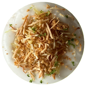 VEGAN DONUT FILLED WITH PINEAPPLE AND LIME COMPOTE, TOPPED WITH COCONUT GLAZE AND COCONUT CRUMBLE.