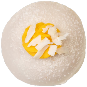 $11.00A BRIOCHE DONUT FILLED WITH A MANGO MOUSSE, TOPPED WITH COCONUT GLAZE AND FINISHED WITH A MANGO BUTTERCREAM AND COCONUT.