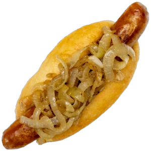 $8.00A SOFT BRIOCHE LONG JOHN LOADED WITH PORK SAUSAGE, ONION JAM AND GRILLED ONIONS, SERVED WITH YOUR CHOICE OF SAUCE.